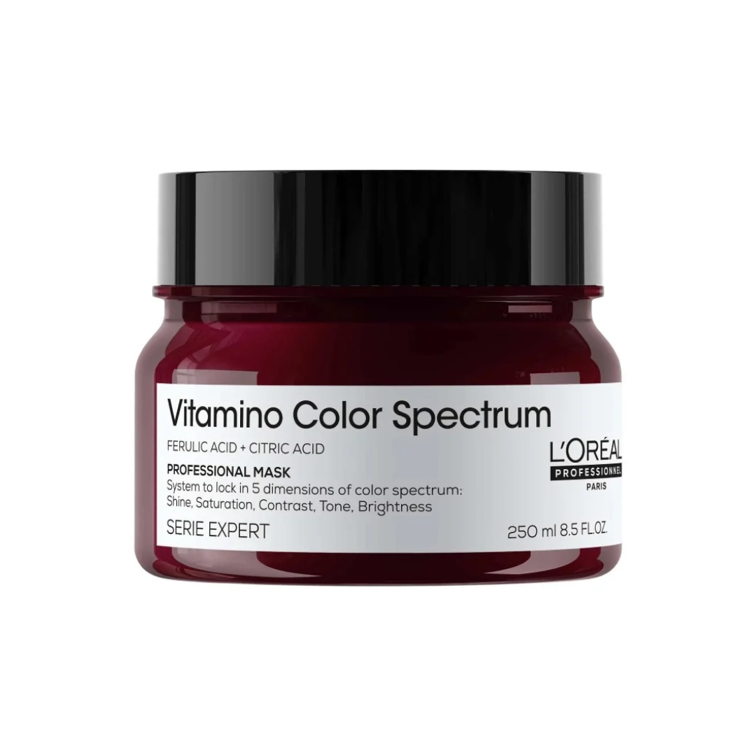 Mascarilla Capilar L’Oréal Professionnel Vitamino Color Spectrum 250 ml sella el color y aporta brillo vidrio con suavidad sedosa para cabello teñido